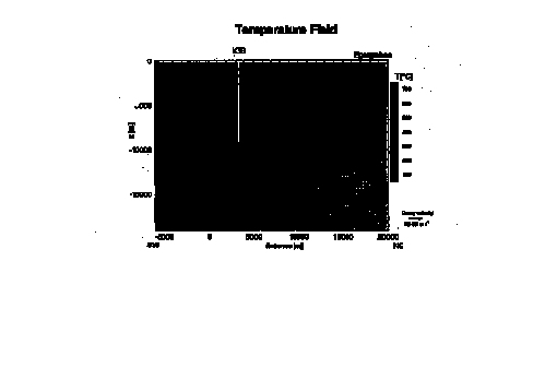 Fig. 2: 2-D simulation of an underground convection system assuming a permeability of 10-17m2 in a depth of 14-19 km.