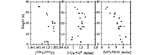 The detailed sampling of the Prazim Valley section allow us to monitor the behaviour of U isotopes and trace element ratios through time. Fig. 1 displays 234U/238U activity ratios U/Ca and Sr/Ca concentrations versus height of the section. 234U/238U, U/Ca (molar) and Sr/Ca (molar) ratios range between 1.46 and 1.52, 0.89 and 1.81*10-6 and 5.64 to 8.36*10-3 respectively. Sr/Ca ratios show a secular decrease along the section, with change in the slope at about 23 m. Similar trend was observed in the Masada section north of the Prazim section (Katz et al., 1977).