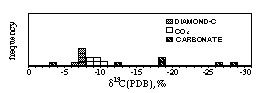 The carbon isotope ratios of diamond carbon and of CO2 are distributed in rather smaller range from -6 to -8 and from -8 to -10 in d13C (PDB) respectively, while that of carbonate scatters widely from -3 to -28 (Fig. 1). The accuracy of the data was examined from different aspects and no evidence against the widely scattering data was obtained. The carbon isotope of diamond carbon seems to correlate with CO2/(H2O+CO2) of the inclusion and that of CO2 correlates loosely with brightness of diamond specimens.